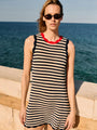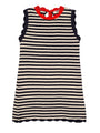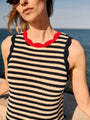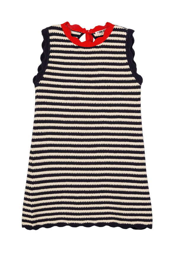 The Fasano Dress in Stripe is a sleeveless crochet mini dress. It features a keyhole tie in the back and a red neckline with a scalloped hem.