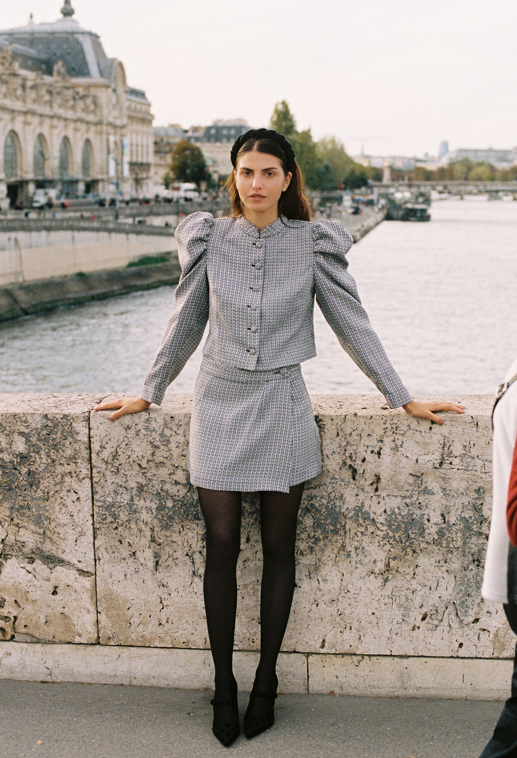 • Woman wearing a black and white checkered gingham jacket and matching mini dress sitting on an ornate chair in a decorated room.