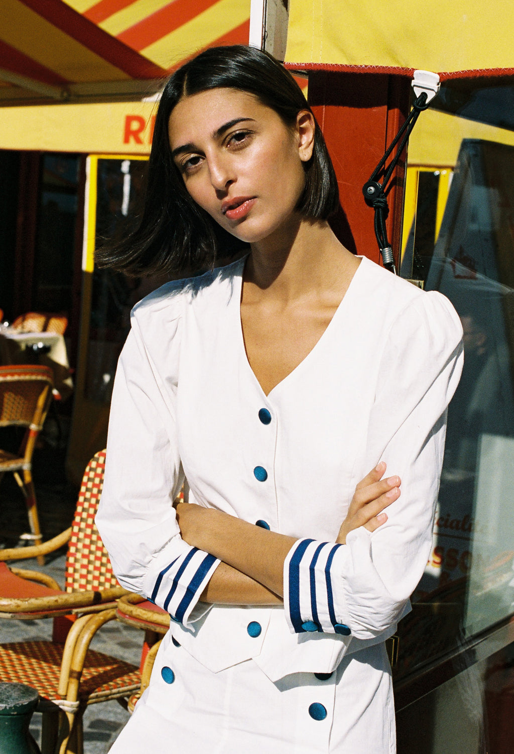 • Woman wearing an off white jacket with black embroidery detailing, black collar and dark horn buttons and silky white shorts on standing outdoors in front of a building with plants