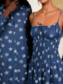 The Russo Dress in Starfish is a cotton midi-length, spaghetti strap dress featuring 2 tiers of smocking under the bust and a keyhole tie at the bust. Straps are adjustable.