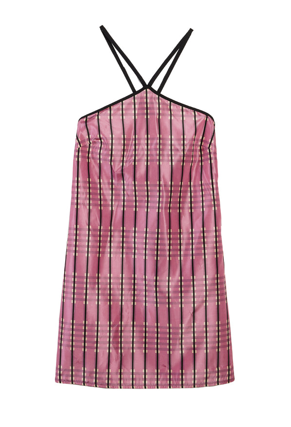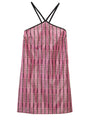 The Noemi Dress in Garnet is a printed taffeta halter mini dress with contrasting black straps that cross in the back. Center zipper back closure.