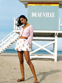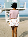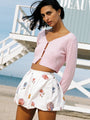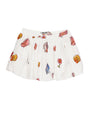 The Antonia Skirt in shell is a printed cotton mini bubble skirt featuring an inner short for coverage and side zipper closure.