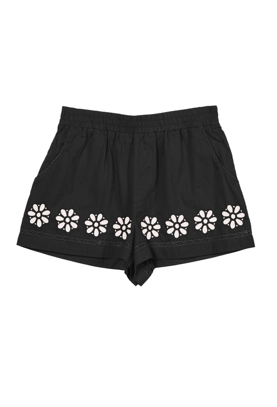Cropped waist down of woman wearing shorts with a floral blood orange waistband and white legs with yellow sun pattern and blue hem detail on a plain background