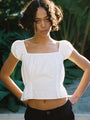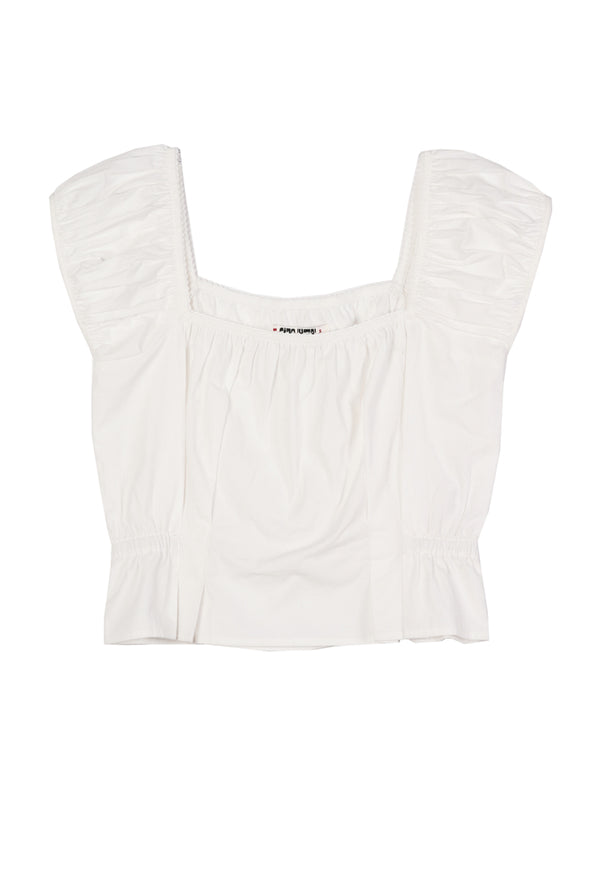 The Lille Top in white is a cap sleeved, slightly cropped cotton poplin top with cinching detail at the waist.