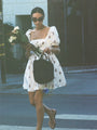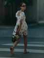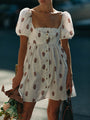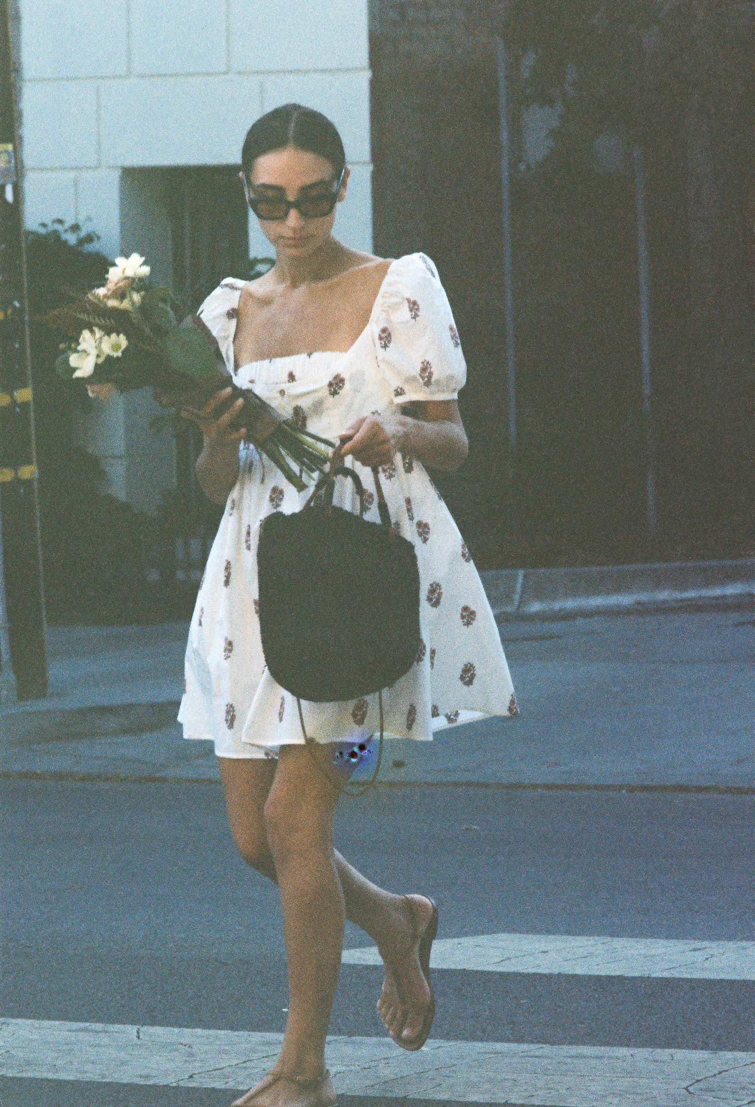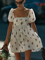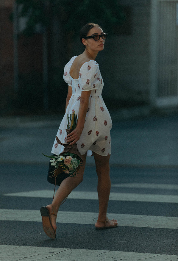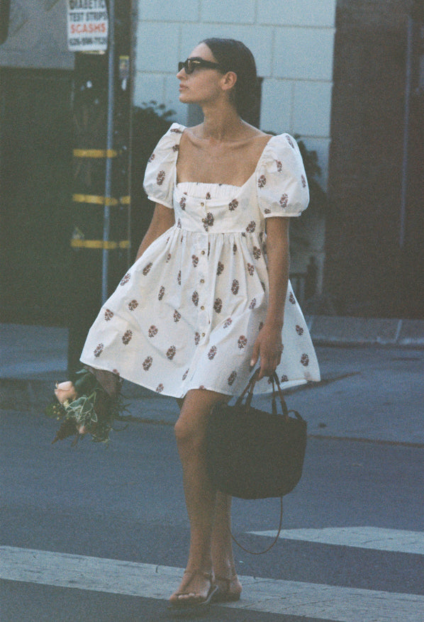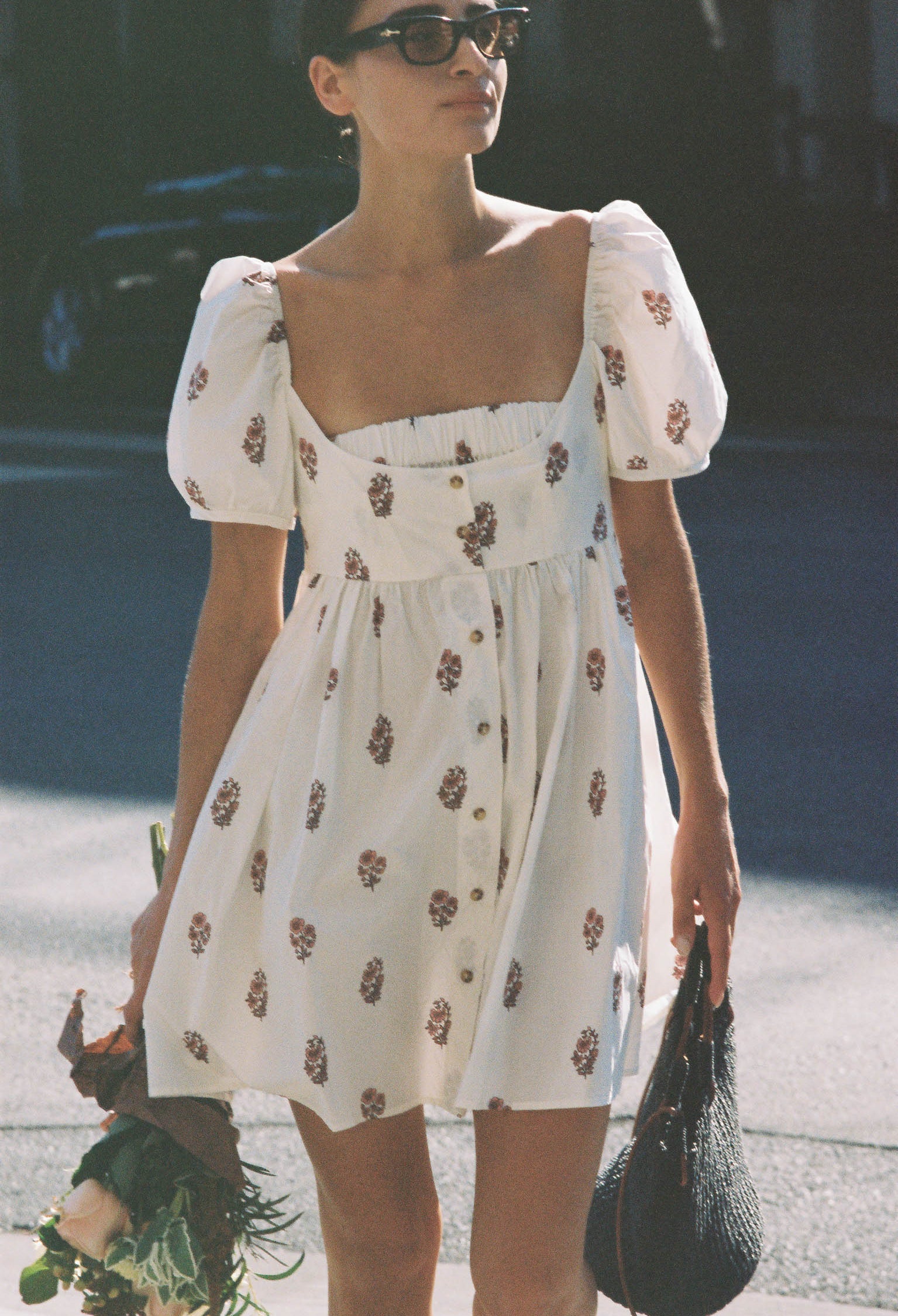 The Diana Dress in Blush is a printed cotton pouf-sleeved mini dress. It features an empire waist, non-functional buttons down the front, and an inner bodice at the bust. The sleeves have elastic and there is a center back zip closure.