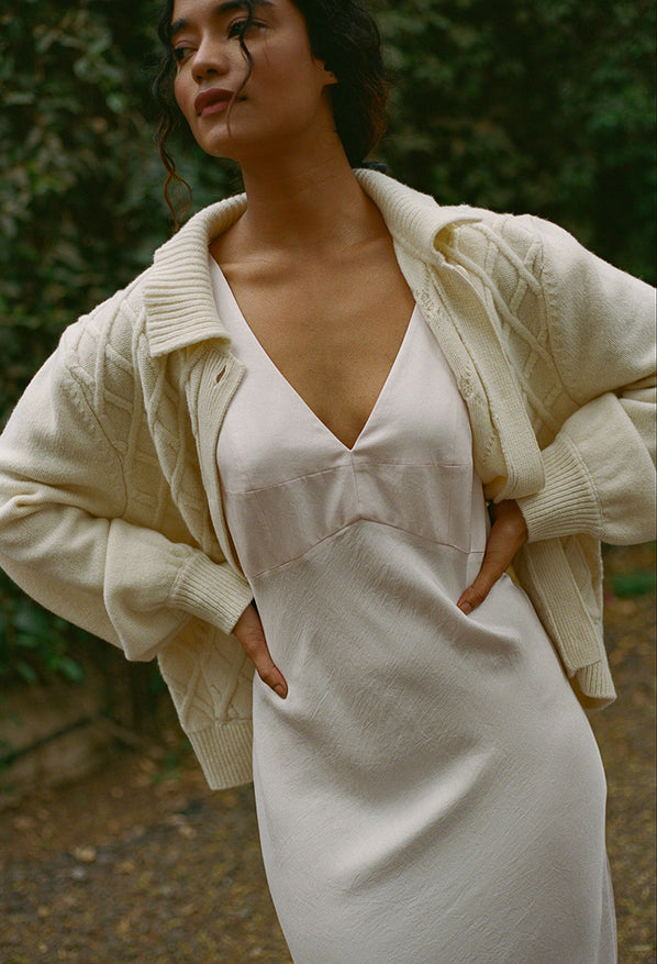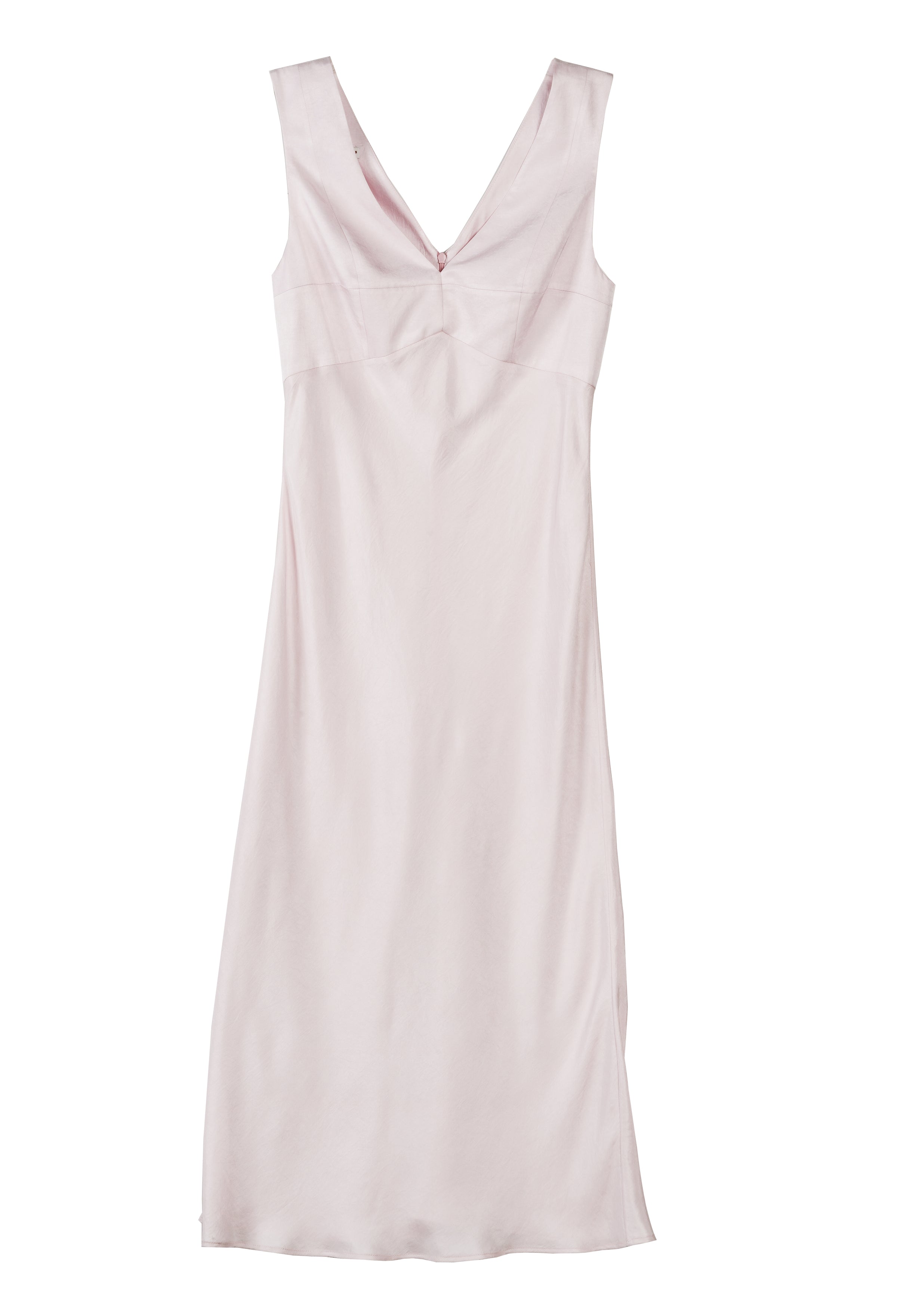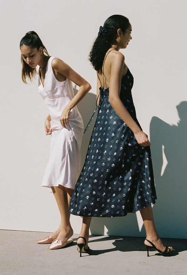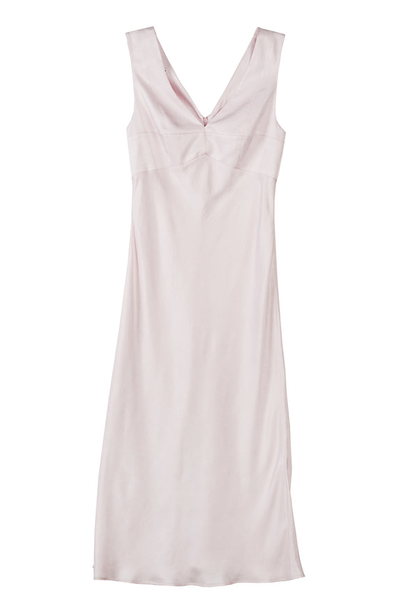 The Draco Dress in Rose is a silk midi-length, sleeveless dress featuring a v at the neck and back. Center back zipper closure
