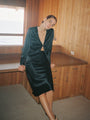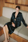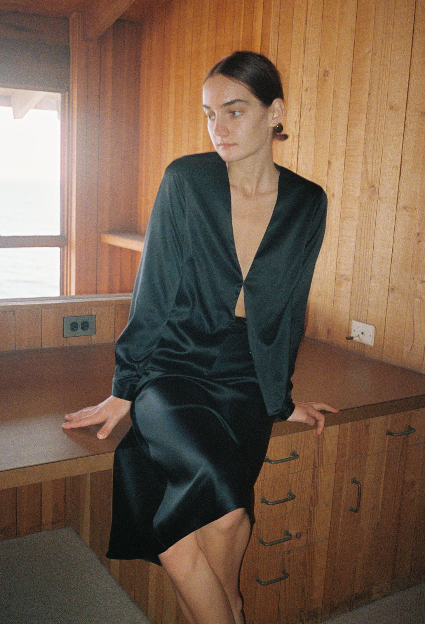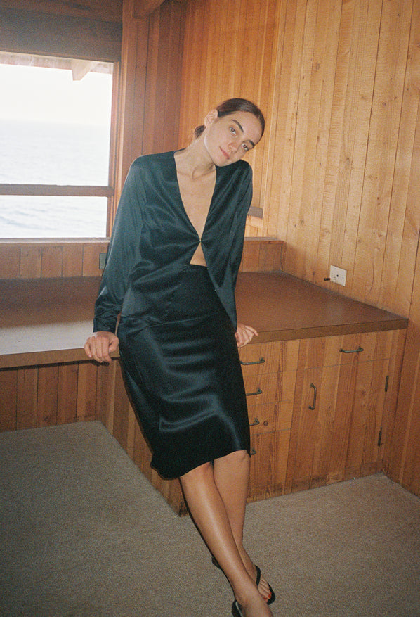The Ludavica Top in black is a silk long sleeve top with a v-neck line and 3 hook and eye closures down the front. Pair it with the Valeria skirt.